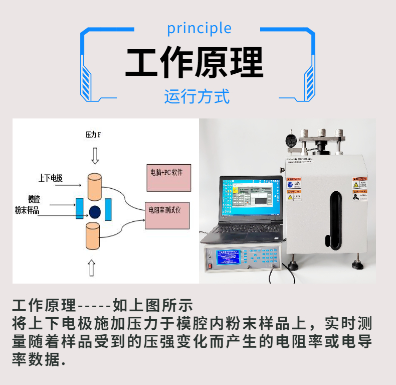 粉末電阻率測試儀的工作原理:將上下電極加壓于模腔內粉末樣品上,實時測量隨著樣品受到的壓強變化而產生的電阻率或電導率數據.