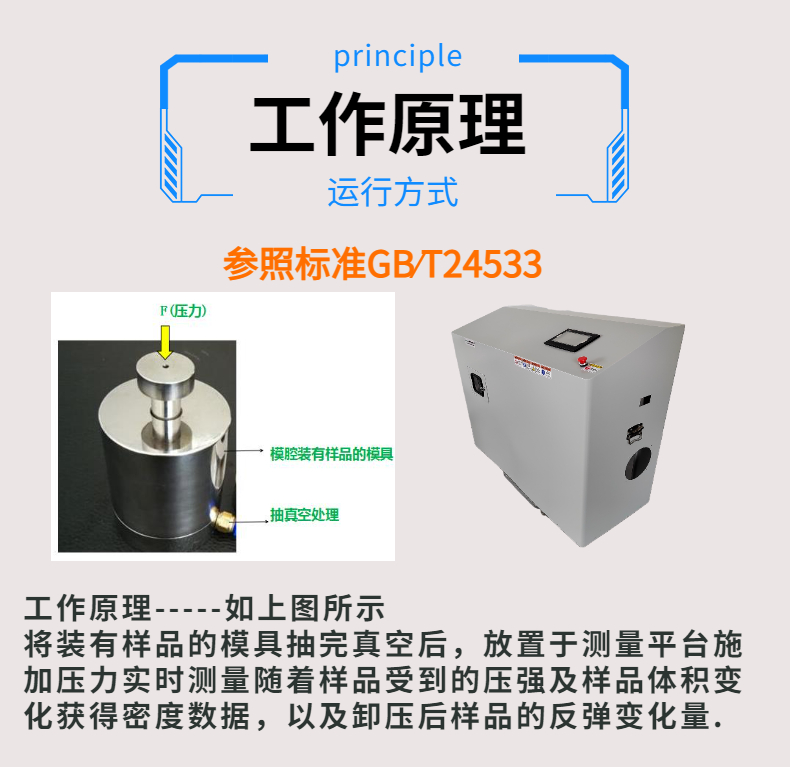 工作原理:將裝有樣品的模具抽完真空后,放置于測量平臺施加壓力,并實時測量隨著樣品收到的壓強及樣品體積變化獲得密度,以及卸@壓后獲得反彈變化量.