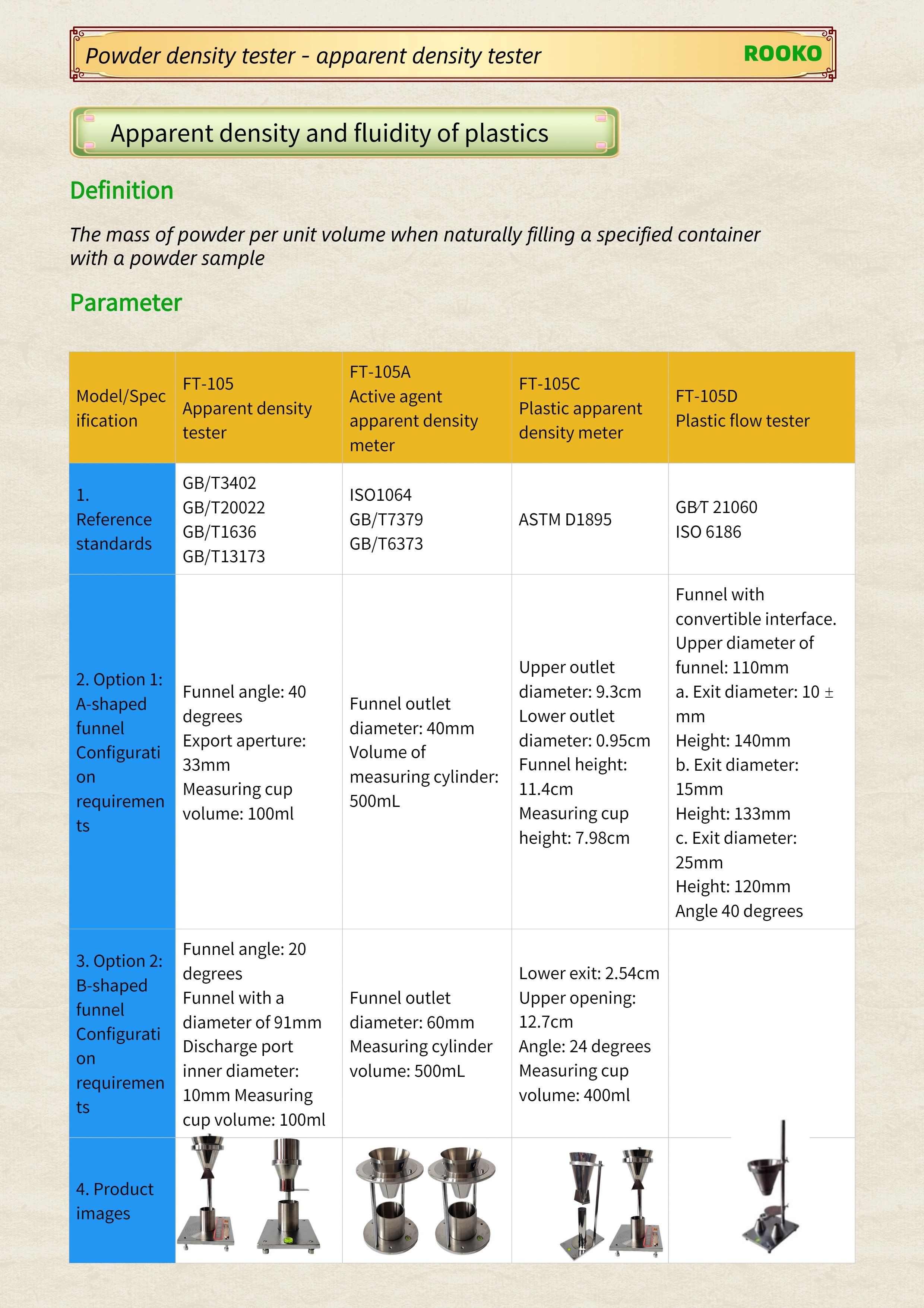 FT-104 104A 104C Apparent density, angle of repose, flow angle, liquidity