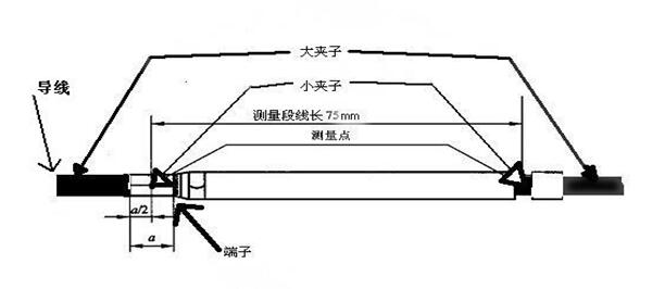 如上示兩圖中,圖1導線首端帶有端子,測量75mm長帶端子導線的兩端壓降,記錄數(shù)據(jù)備用;圖2中導線不帶端子,直接測量75mm長導線的兩端壓降,記錄數(shù)據(jù);用圖1中測得的壓降減去圖2中測得的壓降即為被測端子的壓降。